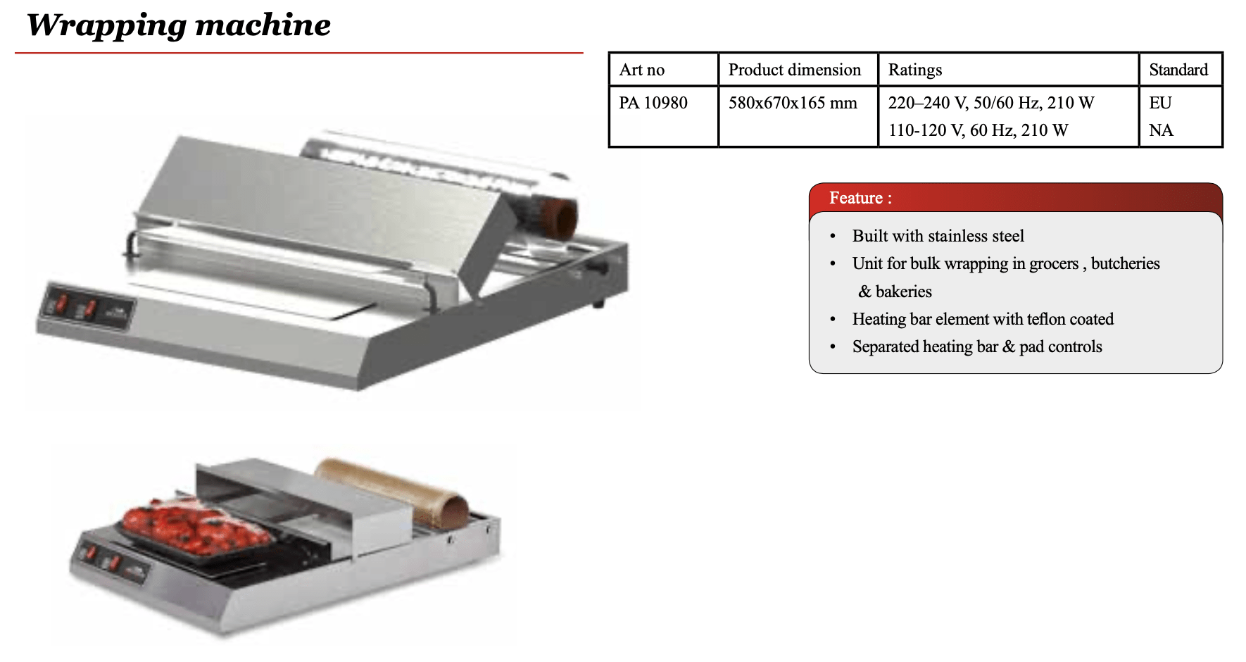 220–240 V, 50/60 Hz, 210 W EU 110-120 V, 60 Hz, 210 W NA